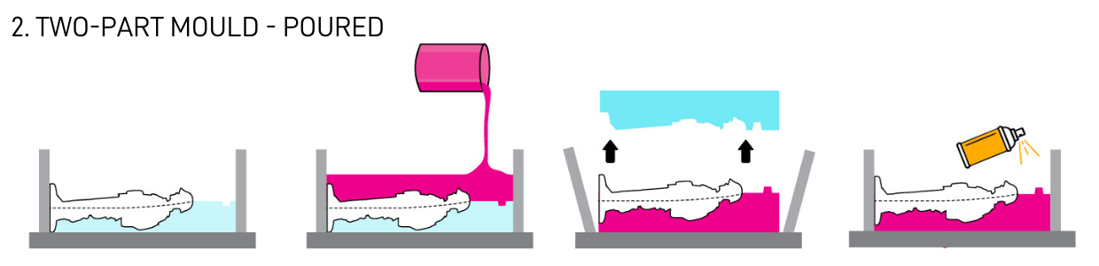 Re-assemble and secure the mould box around the cured silicone slab. Apply an appropriate release agent to prevent the two halves from bonding together. For the best coverage, spray or apply the release agent at different angles. Once fully coated, you’re ready to pour the second half of the mould.
