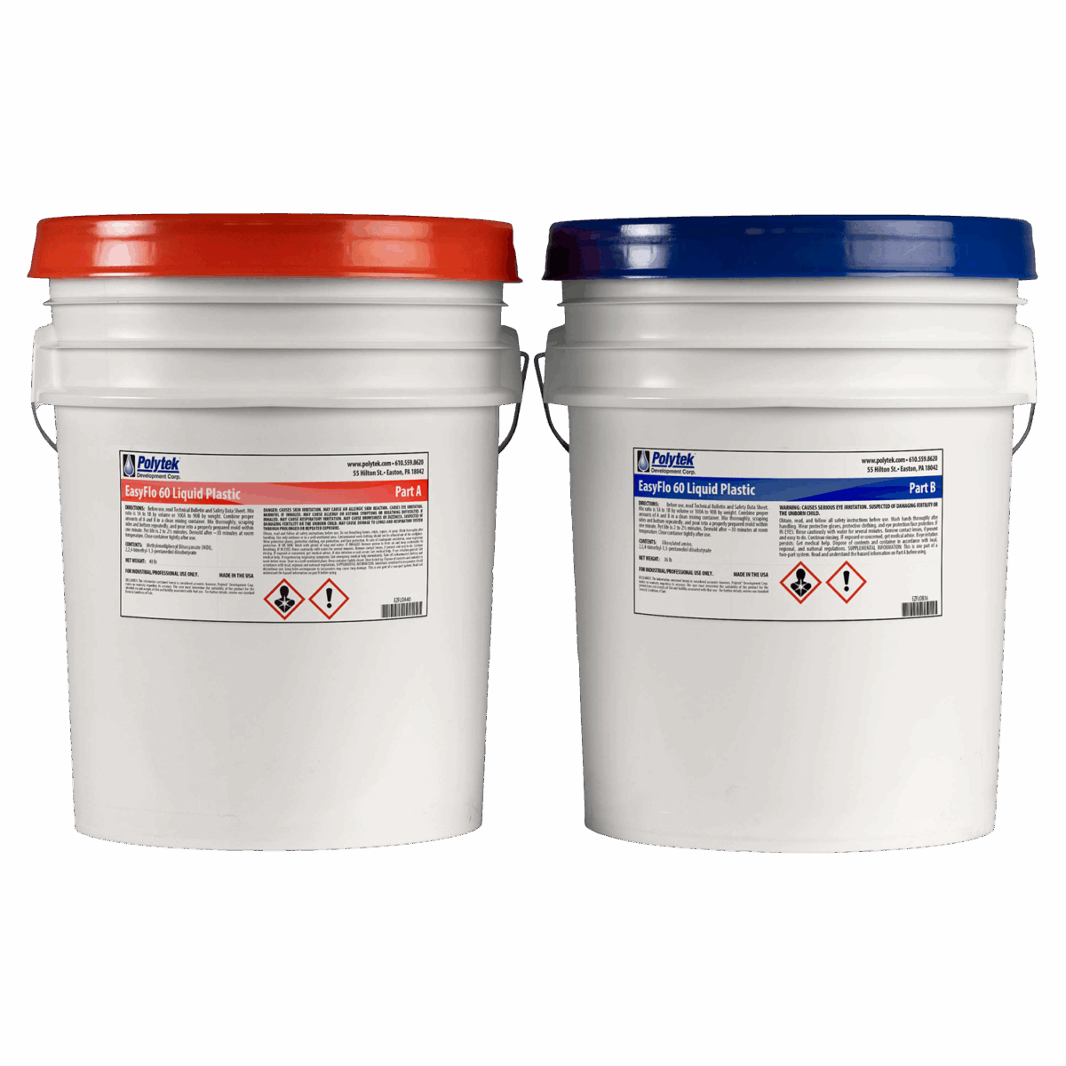 EasyFlo 60 Liquid Plastic is a two-part, liquid polyurethane resin that cures (RTV) to a white, Shore D65 plastic. This product has a simple 1A:1B mix ratio by volume and a fast demold time of 15 to 30 minutes. EasyFlo 60 is a super low-viscosity, pourable plastic, but it can be easily thickened with PolyFiber II Thickener for brush-on application.